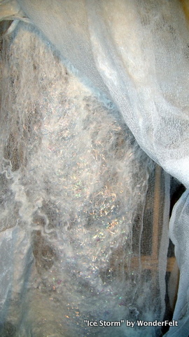 Recently, I began to experiment with first making an item from un-dyed fibers and then hand painting the dye on after the felting stage was done. I made a small scarf and was very pleased with the result. So, I jumped right in and made a top next! Below is the result, layers of silk gauze, under and over the merino wool. Embellished with handspun silk yarn, banana fiber, China silk and more gauze.